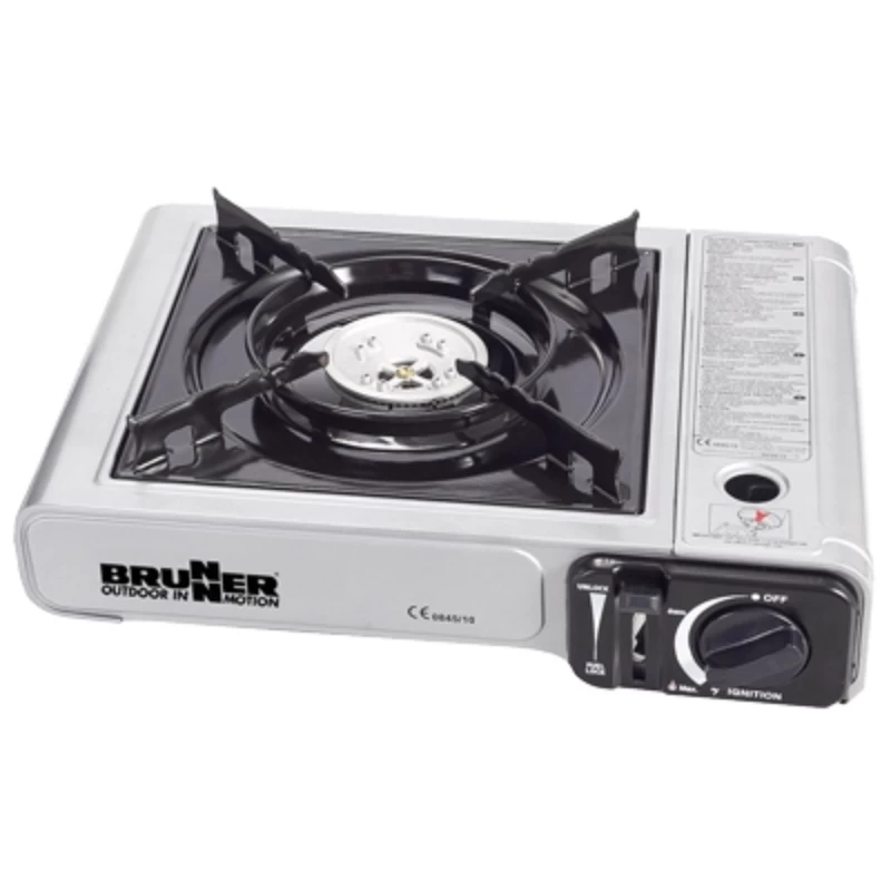Kartuschen-Gaskocher mit integrierter Piezozündung und Alu-Brenner. Gaszufuhr ist regelbar. Ohne Zündsicherung. Inklusive Transportkoffer