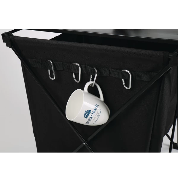 Tischplatte zum Öffnen, um in der Tasche Wäsche, Handtücher, Spielzeug, etc. zu verstauen. Mit 8 Karabinerhaken (je 4 auf 2 Seiten).