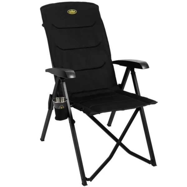 Der bequem gepolsterte Faltstuhl La Palma Deluxe punktet mit einem optimierten Spannsitz und einer hohen Rückenlehne für mehr Komfort. Die Rückenlehne ist in 5 Positionen einstellbar. Das Material ist oben atmungsaktives Mesh und unten strapazierfähiges Polyester. Das Gestell ist aus einem schwarz-beschichtetes Aluminium.