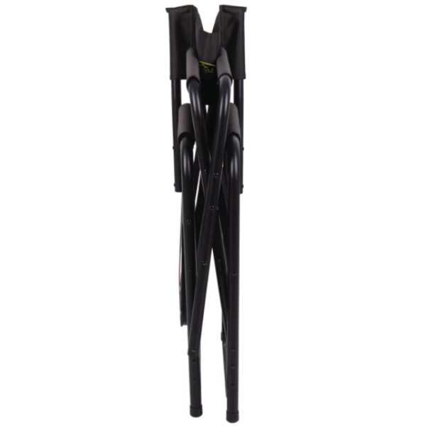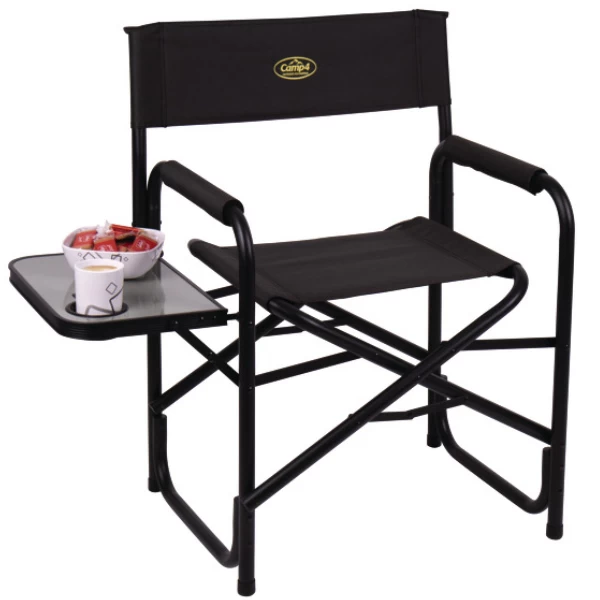 Der kompakte Regiestuhl Maxi DeLuxe II Black mit Seitentisch ist ein bewährter Begleiter. Er hat ein schwarzes Gestell mit gepolsterten Armlehnen. Der Seitentisch hat eine praktische Vertiefung für Becher, Tasse, Flasche, etc. Der Regiestuhl ist platzsparend verstaubar und hat einen Sicherheits-Faltmechanismus.