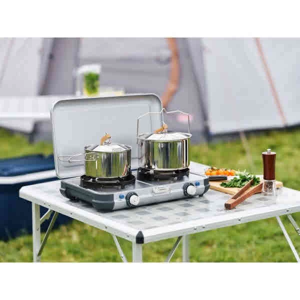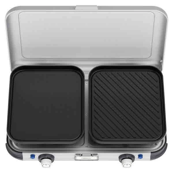 Leichter und einfach zu transportierender Kocher mit zwei Brennern sowie Grillrost und Planchaplatte. Mit Piezozündung und Easy Clic™ Verbindung für Campingaz® Ventilkartusche CV 470+. Inkl. Schlauch, Regler und Tragetasche.