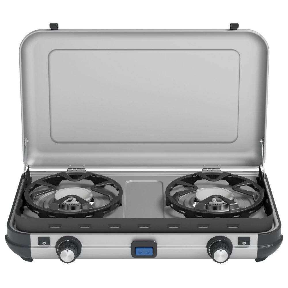 Der mit Gaszylinder betriebene Camping Kitchen 2 Maxi verfügt über zwei unabhängige Brenner, mit denen man Wärme individuell regulieren kann.