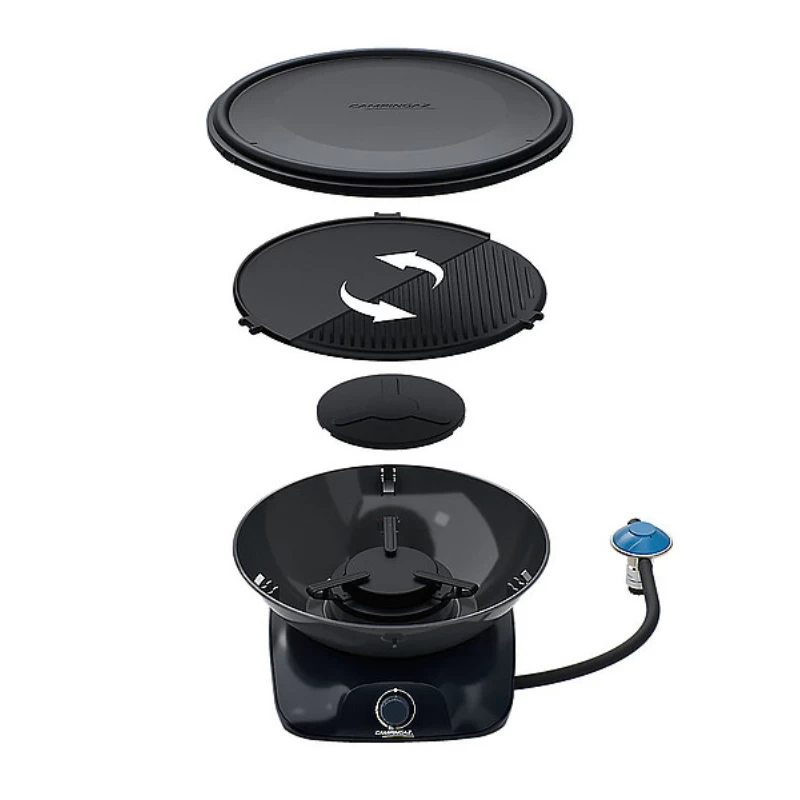 360 Grad Tischgrill mit langlebiger und wendbarer Aluminium-Druckgussplatte, Piezozündung. Inklusive Schutzdeckel, Tragetasche, Schlauch und Regler.