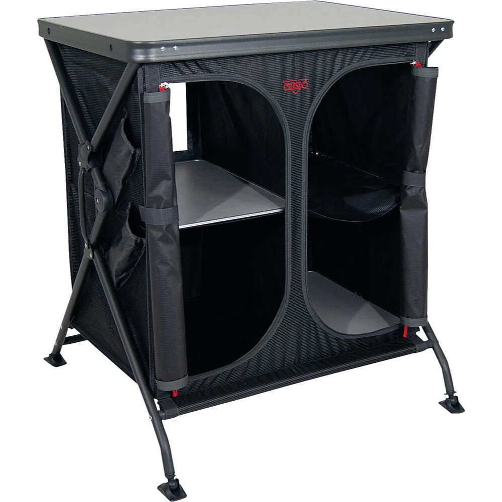 Stabiler Kocherschrank mit 2 Abteilen und Regalen mit exklusivem Faltsystem. HPL-Deckplatte (Hochdrucklaminat), beständig gegen hohe Temperaturen und Feuchtigkeit. Verstellbare Beine mit Stabilisatoren.