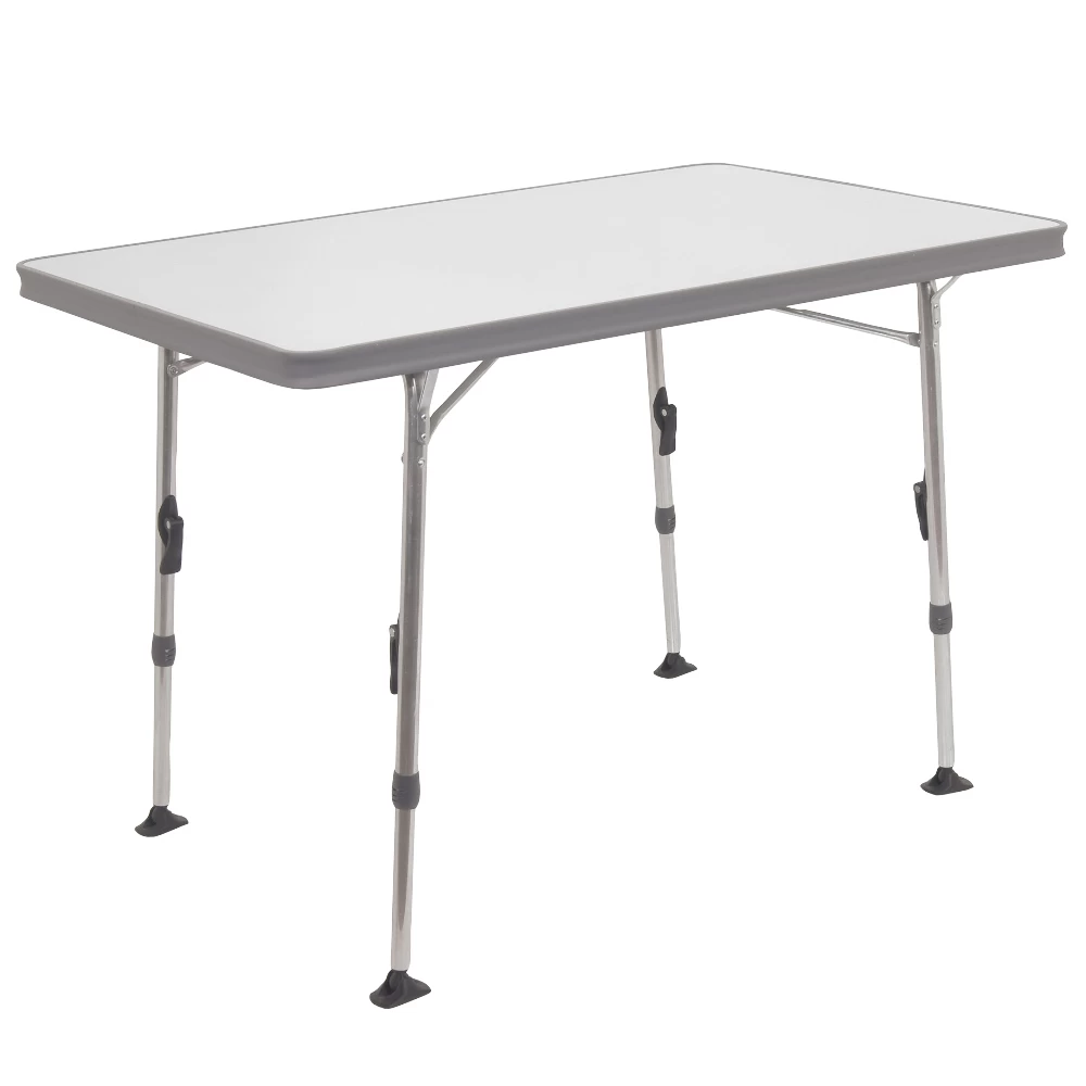 Der bereits seit einigen Jahren bekannte und bewährte Campingtisch von Crespo wurde nun nochmals verbessert und um eine weitere Größe ergänzt. Die einzeln höhenverstellbaren Tischbeine lassen sich in der Höhe von 52 bis 74 cm variieren. Die Tische wurden modifiziert und sind nun noch einfacher zu bedienen. Weiterhin sind die Campingtische absolute Leichtgewichte und dank der mit einem pulverbeschichteten Aluminiumprofil verstärkten Tischplatte sehr stabil. Die Platte ist zudem wetterfest, hitzebeständig und sehr einfach zu reinigen.