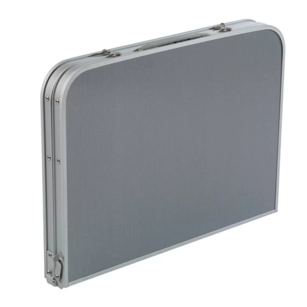 Tisch für 2 bis 4 Personen. Mit kratzfester Schichtstofftischplatte, silber grau gemustert. Aluminium Gestell. Alu Koffertisch Minimax Luxus aus kratzfestem Schichtstoff.