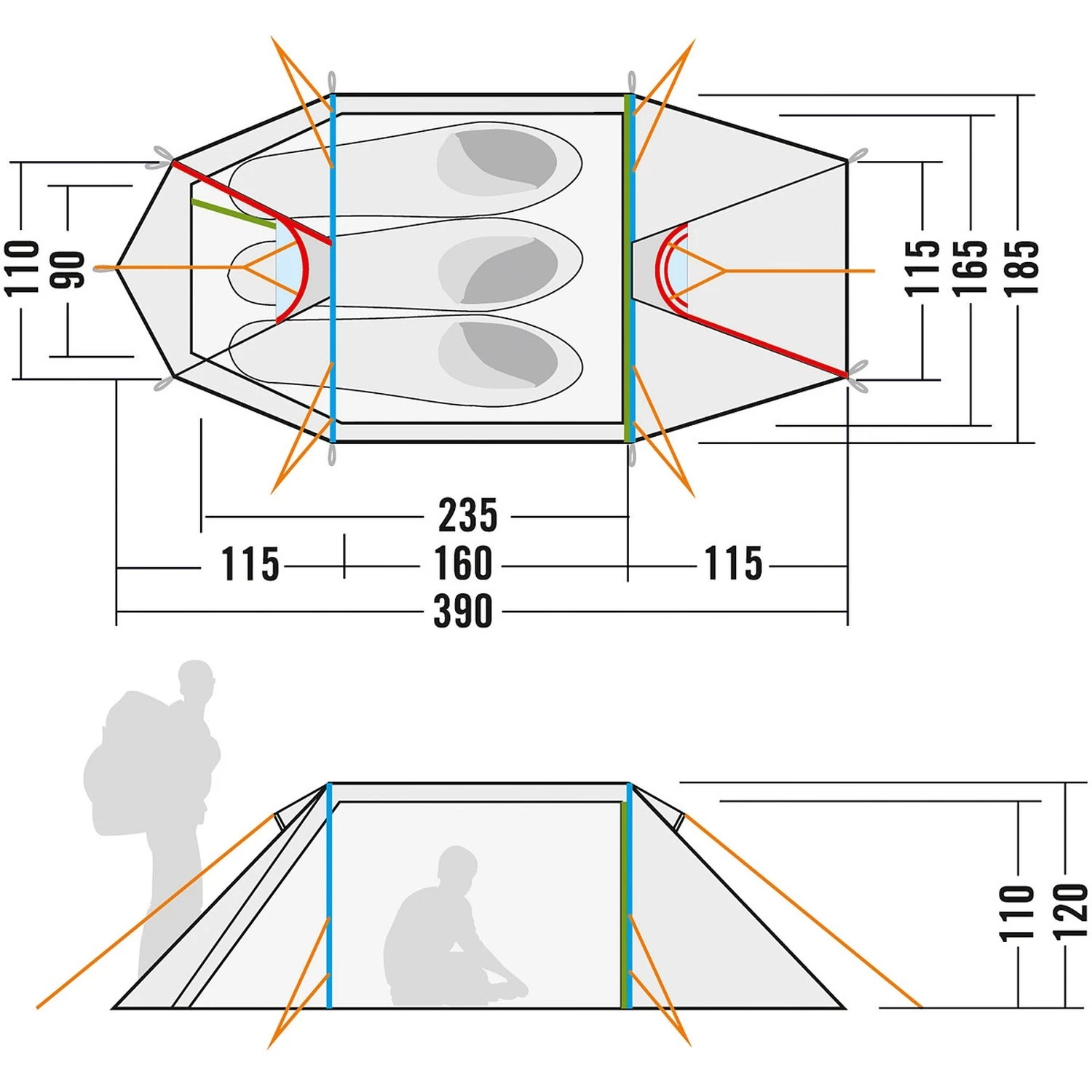 Komfortables 3-Mann-Zelt mit zwei Eingängen und einer kleinen Apside, einfach und schnell aufzubauen.